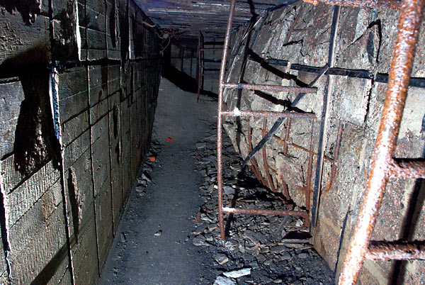 Справа - остатки металлических нар для гарнизона. Следы пожара - по-видимому стены были обшиты деревом. Сбоку в коридоре - колодец с водой. Вода - чистая. Выпученная взрывом стена с торчащими кусками арматуры - следы послевоенного подрыва ДОТа советскими саперами.